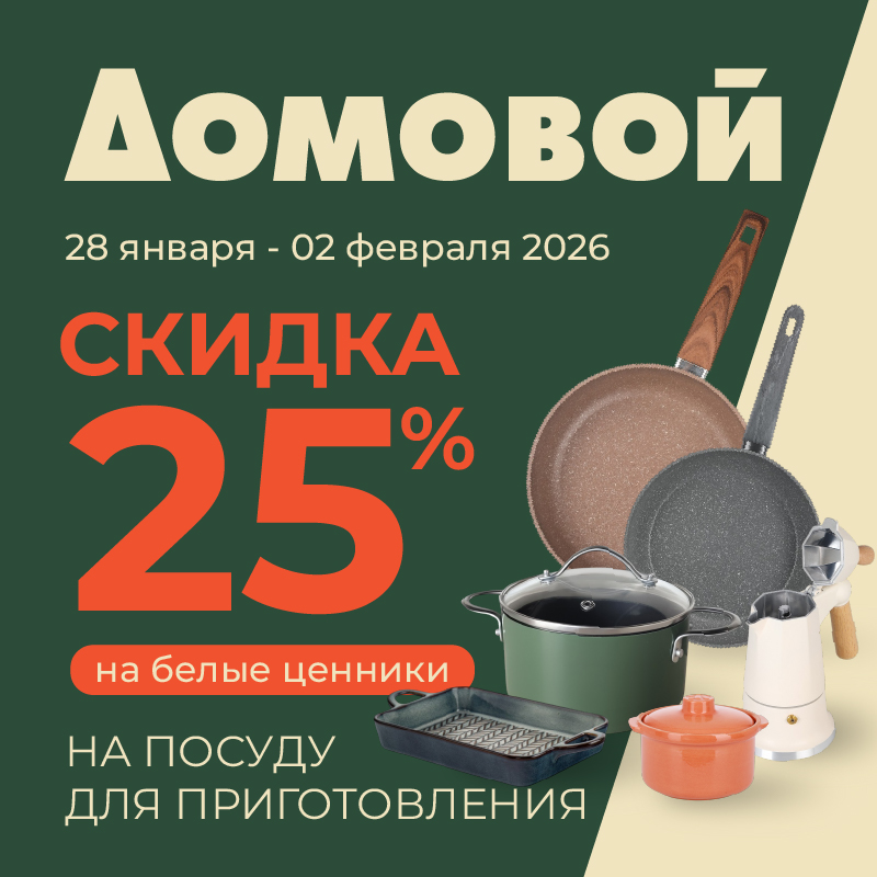 * Скидка действует с 28.01.2026г. по 02.02.2026 г. в розничных магазинах «Домовой» на посуду для приготовления с белыми ценниками по купону с предъявлением дисконтной карты «Домовой».